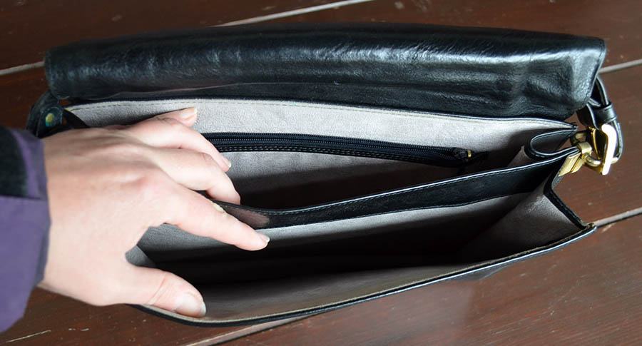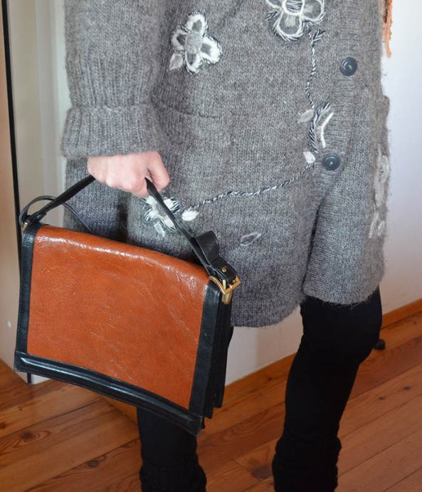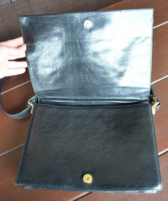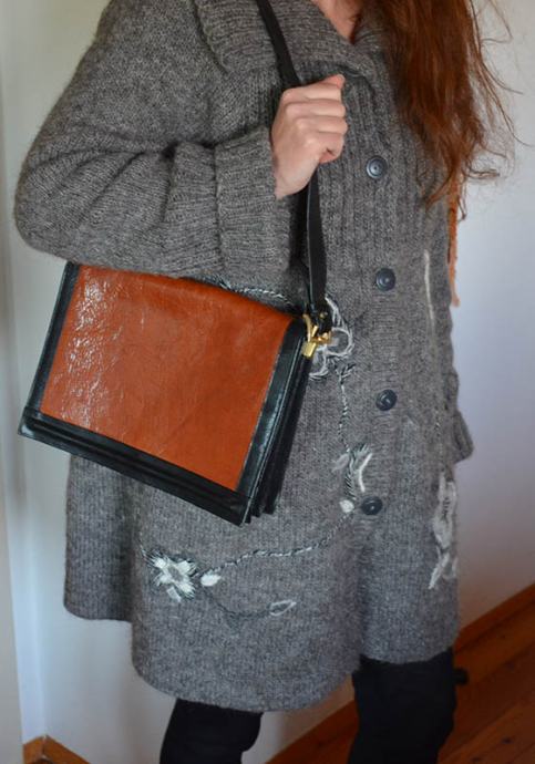 Usnjena ženska torbica, malo rabljena, lepo ohranjena. Torbica je iz pravega usnja rjavo-črne barve. Znotraj sta dva predela in en predalček.