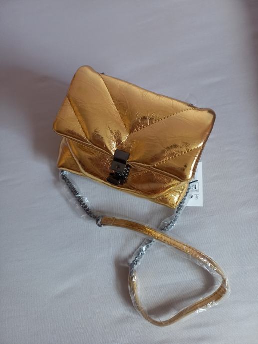 Prodam mini zlato torbico. Je nerabljena, še z etiketo. Noter grejo ključi, drobižnica in manjši telefon (veliki pametni telefoni ne grejo noter).