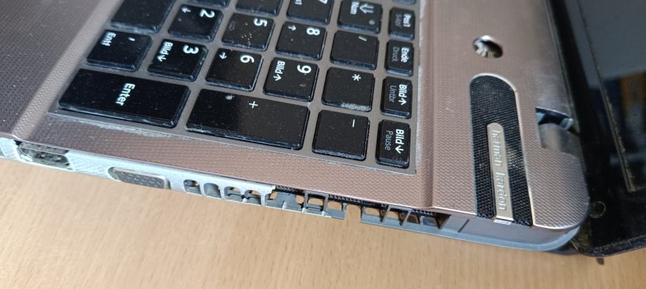 Napake: poceno ohisje in tipka za vklop, hrescijo zvocniki (harman kardon), osvetlitev in tipkovnica ter ekran delujejo bp, nima pa baterije zadaj, je stalno na polnilcu.