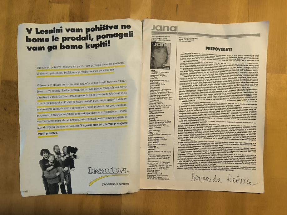 sva vesela, da ste opazili ravno najin oglas, tokrat imava morda ravno Vam ustrezno starejšo revijo Jana številko 6, datum 10.2.1988.