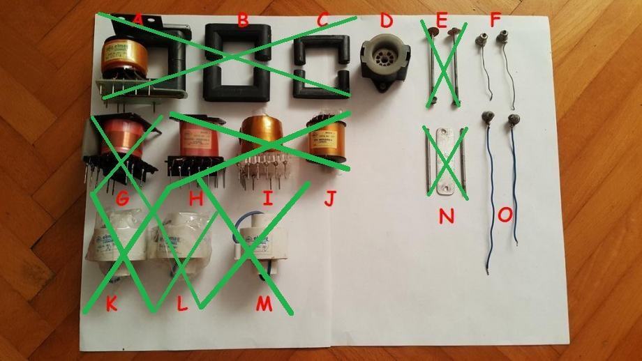 Zraven imam pa še cel kup (povečini) nove rezervne opreme (glej Sliko 10 v oglasu), ki je delala družbo transformatorjev v predalu (razne Ludbreg tuljave povečini). Tukaj imam v mislih predvsem komponente (označene s črkami): A, B, C, G, H, I, J, K, L in M. Cene so: 8 € (A), 3 € (B), 2 € (C), 4 € (G – I), 3 € (J – M).