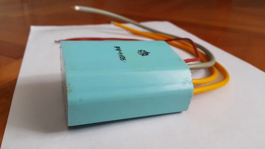 Prodam Iskrin visoko-napetostni (VN) CRT transformator, model PV-1405. Zadeva se mi skorajda že sigurno 30 let nerabljena valja v predalu delavnici. Kozmetično je odlično ohranjen, kot je tudi funkcionalno brezhiben. Žal pa nimam oz. ne poznam absolutno nobenih specifikacij/podrobnosti. Spletno iskanje ni obrodilo sadov. Kot se lahko vidi iz slik v oglasu ima 5 žic, ki štrlijo ven iz araldita. Štiri so dolge okoli 20 cm, siva pa lahko da je 5 cm daljša od predhodnic. Tri debelejše (2x rumena, 1x siva) so verjetno VN izvor oz. sekundar, preostali dve tanjši žici (2x temno rdeča/rjava) pa primar oz. nižjenapetostni vhod. Na ohišju transformatorja so tudi neke oznake (Vin, Vf in C). Okvirne dimenzije so vrisane na tretjii sliki v oglasu, teža zadeve pa je 194,5 g. Vseeno čaka na svojega novega lastnika (kdor ima čas se s tem za poigrat).