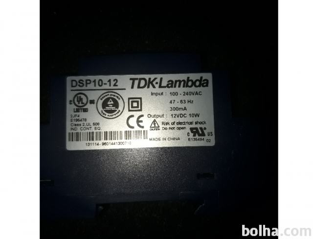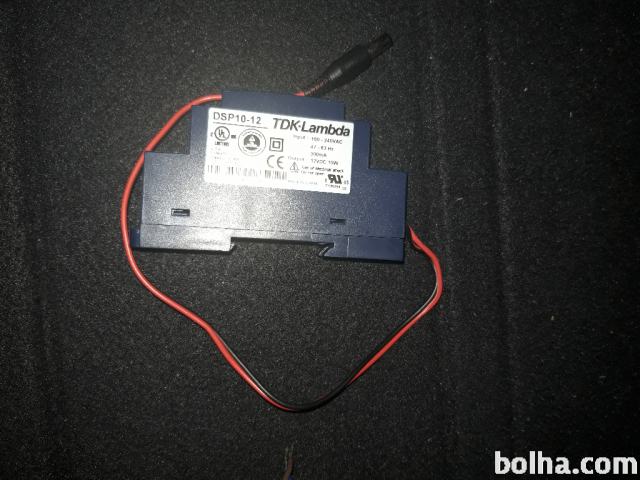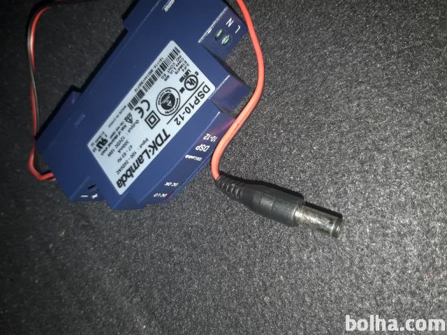 Prodam napajalnik TDK-Lambda DSP10-12, 12VDC, 10W, z ravnim konektorjem 5,5mm. Napajalnik je primeren za napajanje nadzorne kamere. Možna montaža na din letev, več kosov. Cena je 10€ na kos. Telefonska številka za razne informacije 040 124 360, Matej.