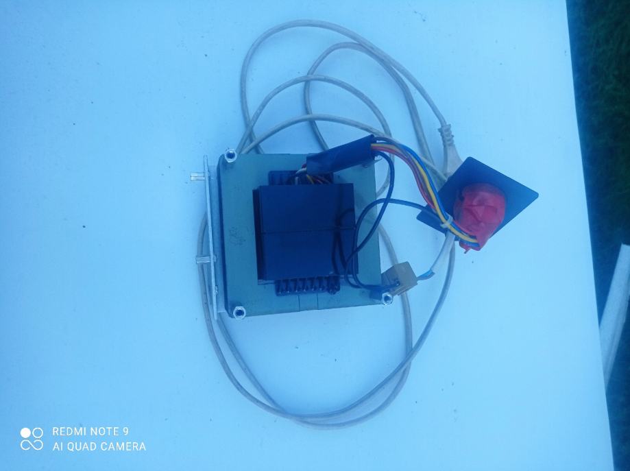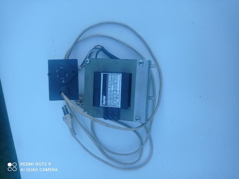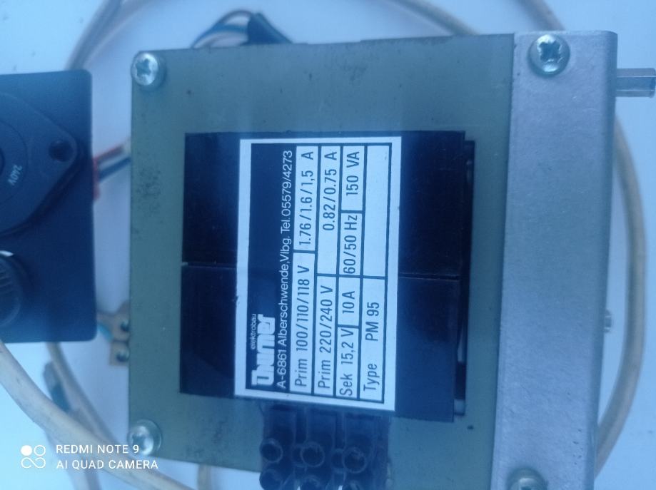 Transformator z izbirnim in varovanim stikalom 100 V 110V 118V 220V 240V. Na sekundarju 15.2 V 10A