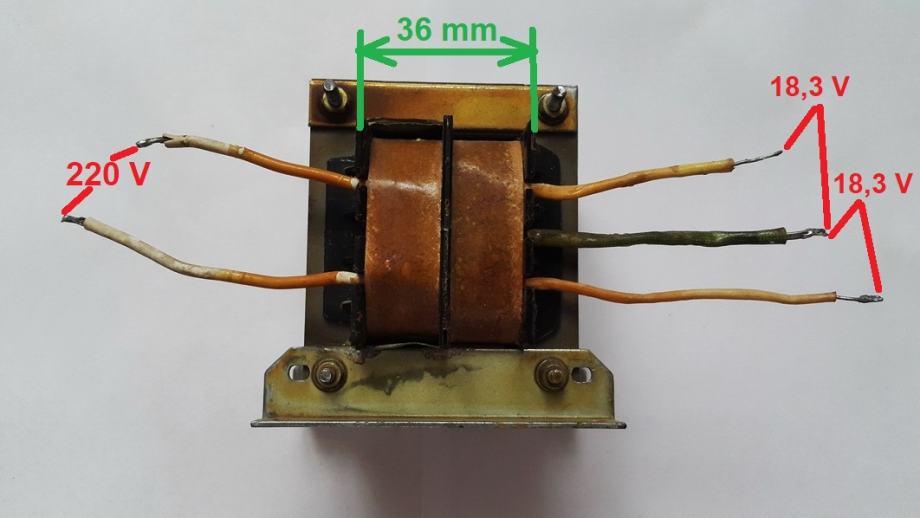 Sekundarna napetost (AC): 18,3 V neobremenjeno (ali 36,6 V, če uporabimo obe beli žici na sekundarju)