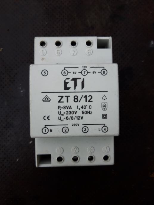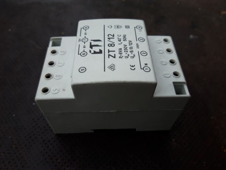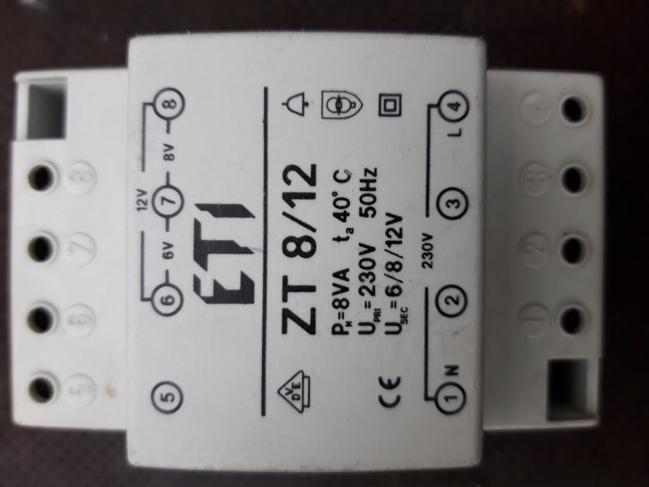 Prodam vgradni zvončni transformator ETI ZT 8/12, moči 8VA in napetosti 6V, 8V in 12V. Cena je 20€. Telefonska številka za razne informacije 040 124 360, Matej.