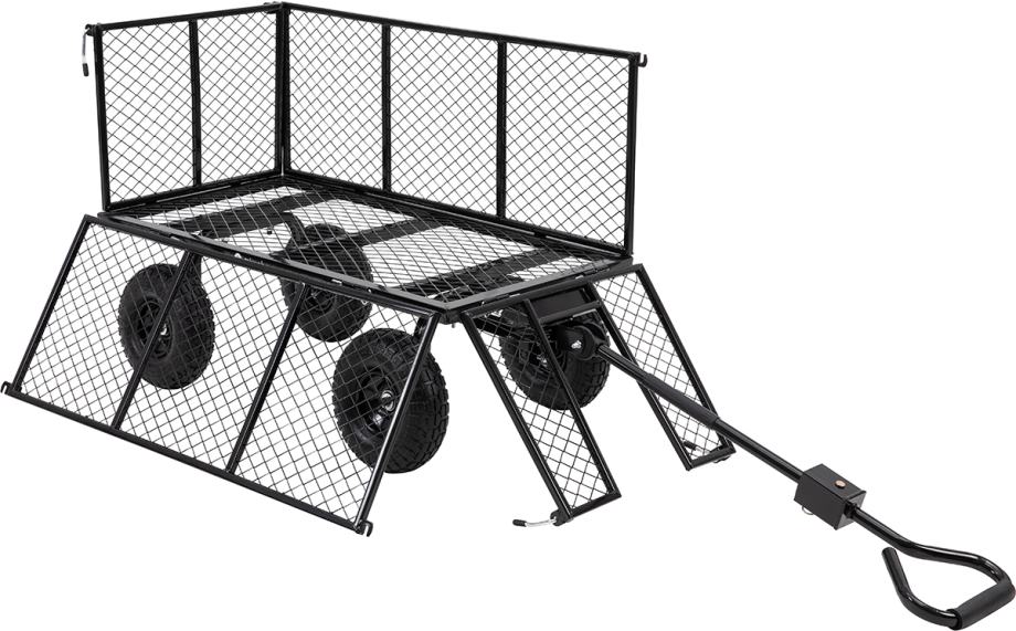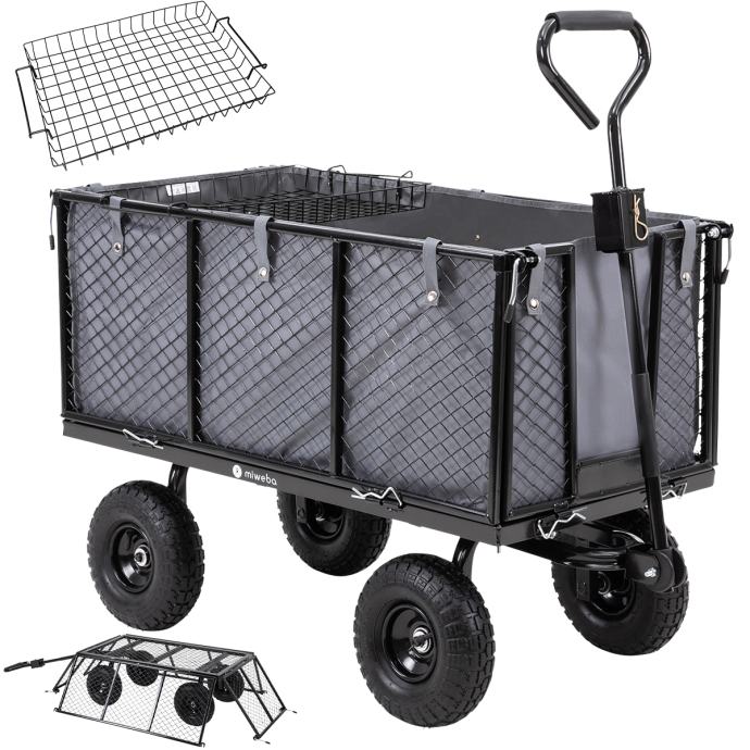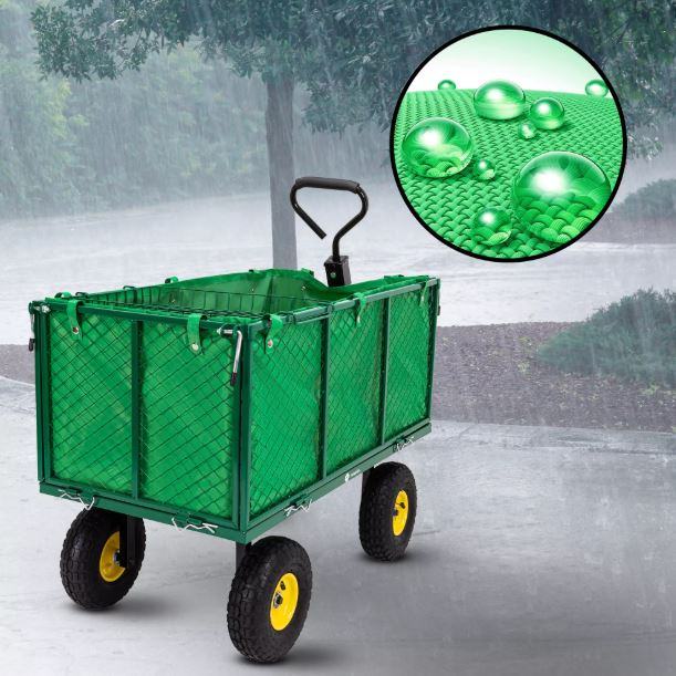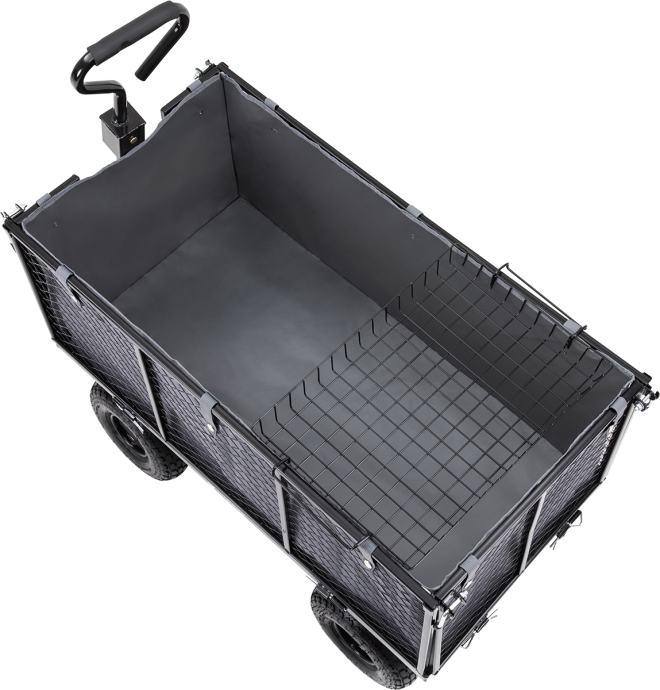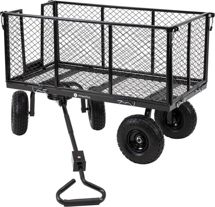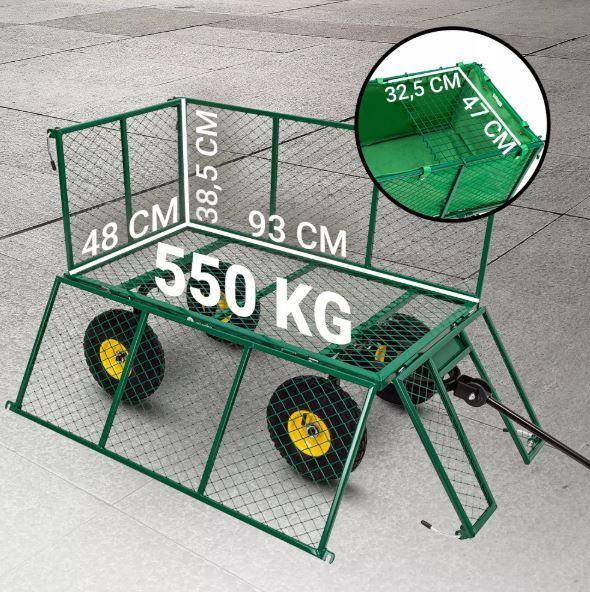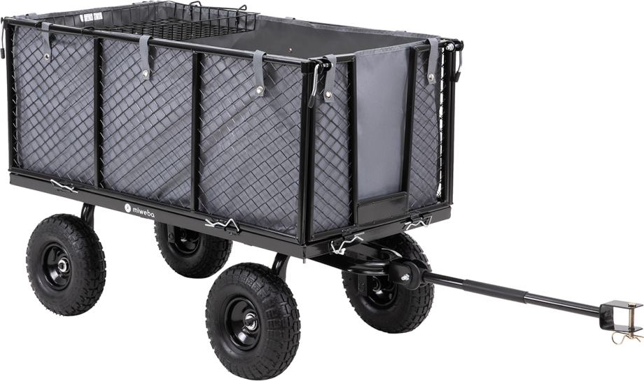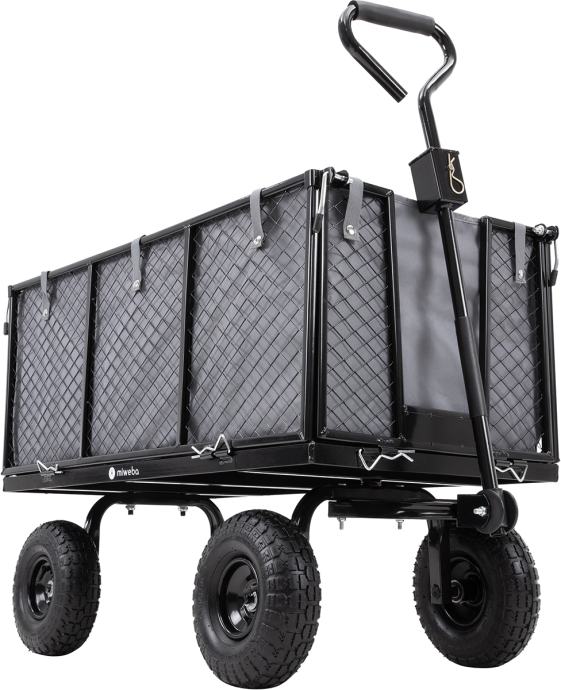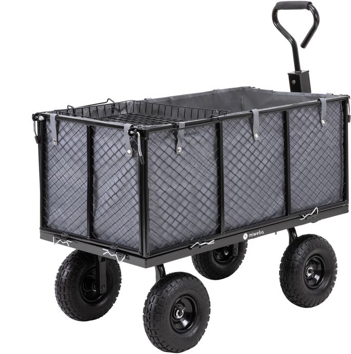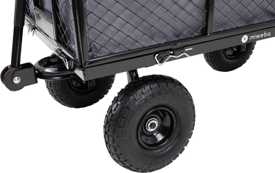 Ročni voziček MB-550 je mojster za vse, ki bo izpolnil vse vaše želje! Z največjo nosilnostjo 550 kg lahko enostavno prevažate tudi težke predmete, kot sta kosilnica ali sod za deževnico. Krmilna os zagotavlja okretnost in enostavno upravljanje vrtnega vozička. Ergonomsko oblikovan ročaj varno leži v vaši roki. Naj bo to na plaži, v gozdu ali na asfaltu – 10-palčne pnevmatike obvladajo vsako površino. Tudi veter in vreme ne moreta škodovati vremensko odporni poliestrski prevleki. Ko pridete domov, lahko transportni voziček bliskovito pospravite zaradi snemljivih stranskih sten in ročaja.