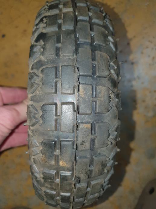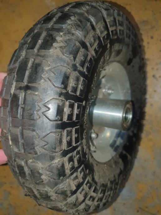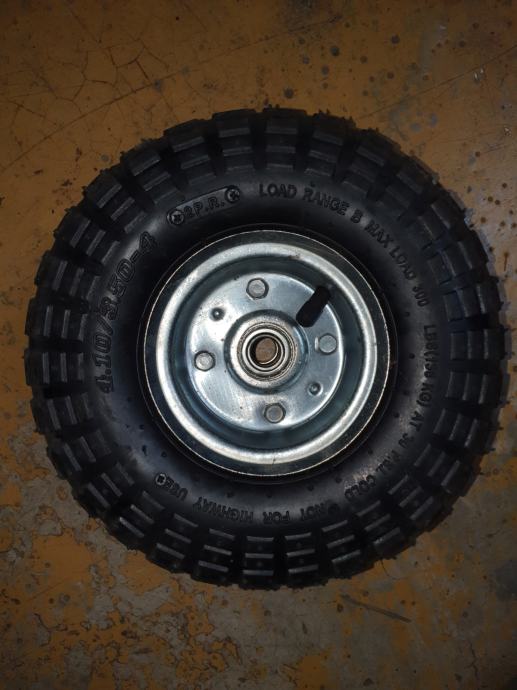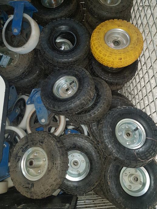 Nova nerabljena kolesa 4cole(cca 26cm) z zračnico montirana na kovinska platišča. Fi luknje ležaja 16mm. Uporabno za razne vozičke doma in v delavnicah.