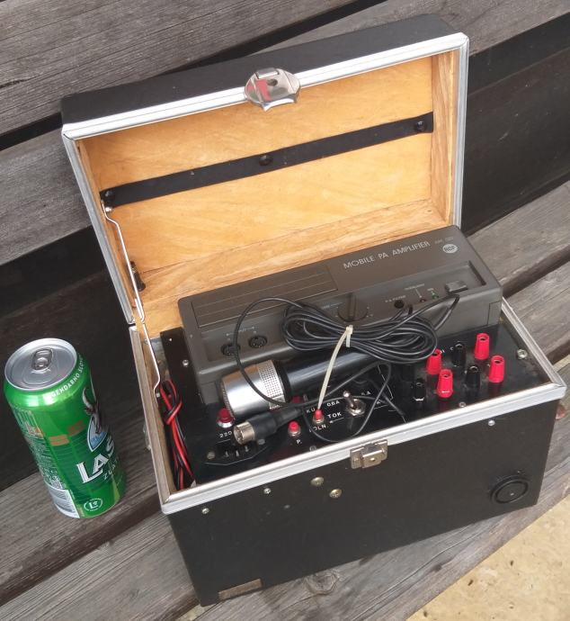 Ojačevalnik ima 2 mikrofonsko linijska vhoda, sedaj vgrajen v kovček z napajalnikom - polnilvcem.