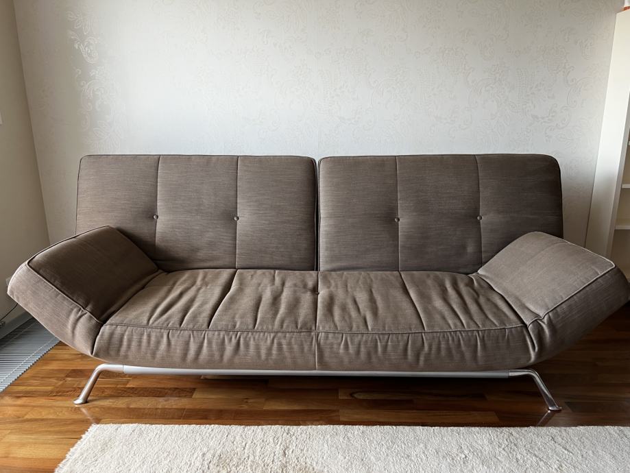 Ligne Roset je francoski proizvajalec pohištva visokega razreda, trosed Smala je njihov oblikovalski presežek. Zelo praktičen, originalna rjava tkanina, dodam še blazino 50 x 70 cm v enakem materialu. Trosed je bil v uporabi v zasebnem nekadilskem počitniškem apartmaju, rabljen nekaj tednov na leto. Dimenzije: 114 x 230 x 87 cm, naslon se dviga in spušča ločeno v dveh delih in v več stopnjah, prav tako nasloni za roke. Ob spuščenih naslonih dobimo ležišče dolžine 230 cm in širine 130 cm.