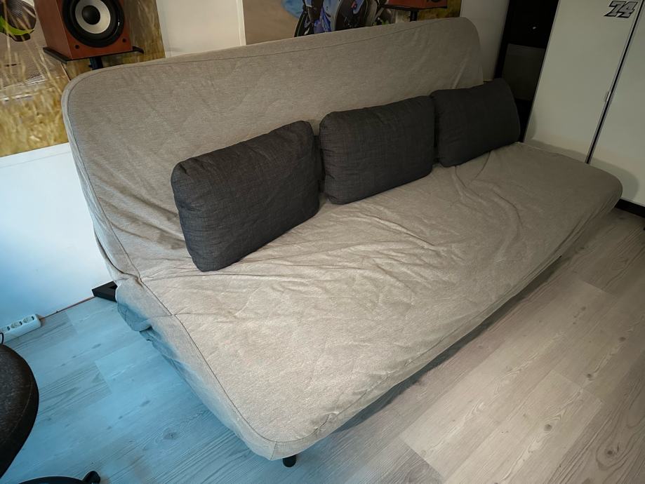 Raztegljiv trosed Nyhamn (Ikea) z vzmetenim posteljnim vložkom, zamenljiva pralna prevleka sive barve in blazinami.