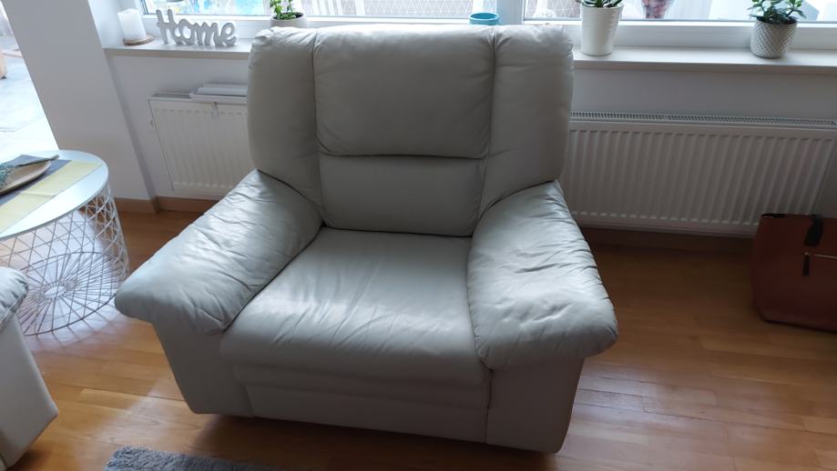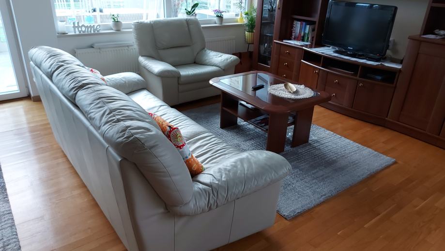 Prodam usnjeno sedežno garnituro, bež barve. Kvalitetno in močno usnje. Trosed in enosed. Trosed ima raztegljivo ležišče. Mere troseda 210x90x90, enosed 110x90x90. Zelo lepo ohranjeno, brez znakov poškodb.