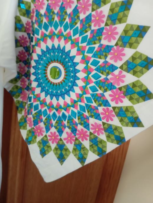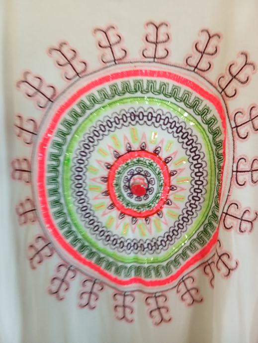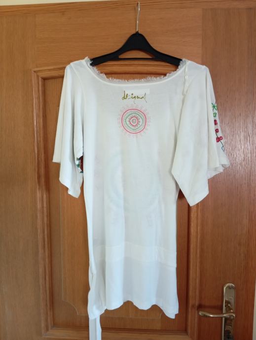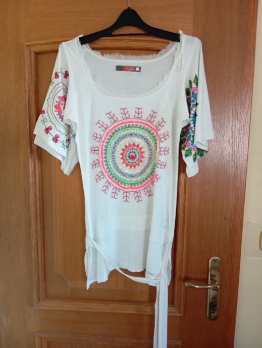 nošena samo 1x za 2 uri, kot nova, v resnici je mnogo lepša kot na sliki, zelo kvalitetna, mehka in prijetna za nošenje (bombaž, viskoza), delno raztegljiva, od ene pazduhe do druge meri 50cm, dolžina je 80cm, ne menjam, ptt ni vključena v ceno, orig. vel. je L, primerna je tudi za M