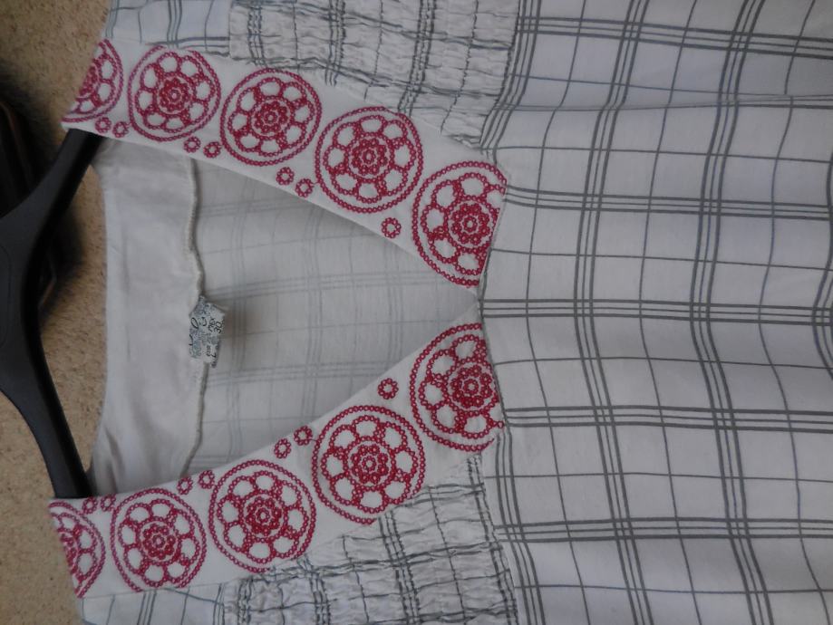 zelo lepo ohranjena bombažna tunika, z rdečo ovezenino na ovratniku, ima 3/4 rokave in je malo raztegljiva.