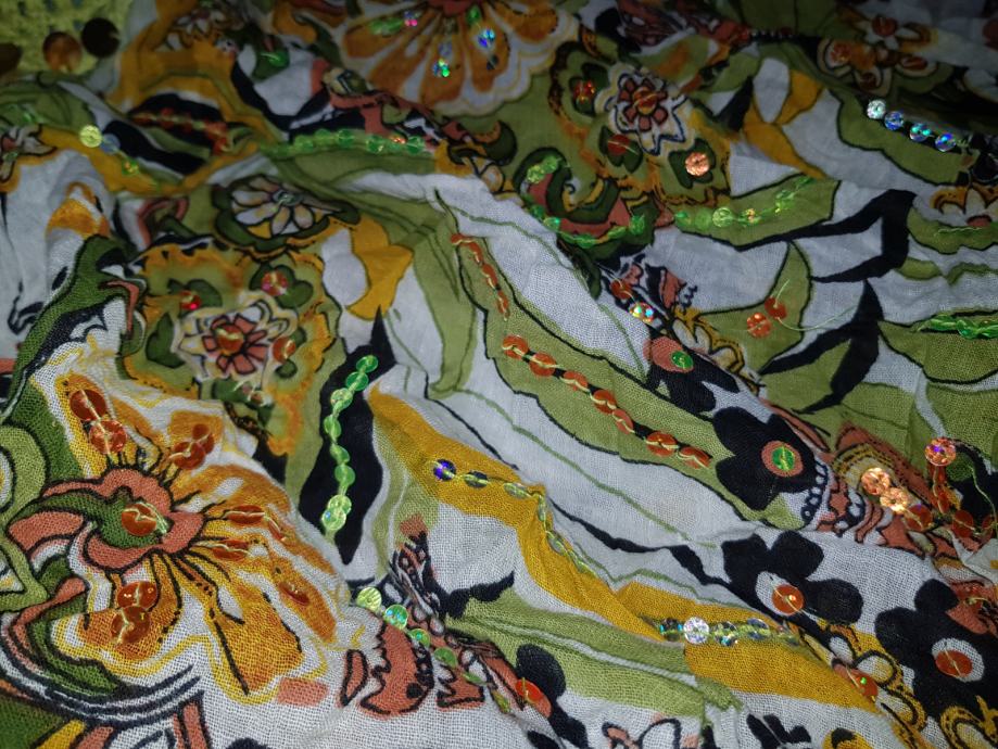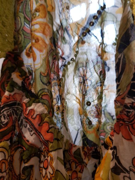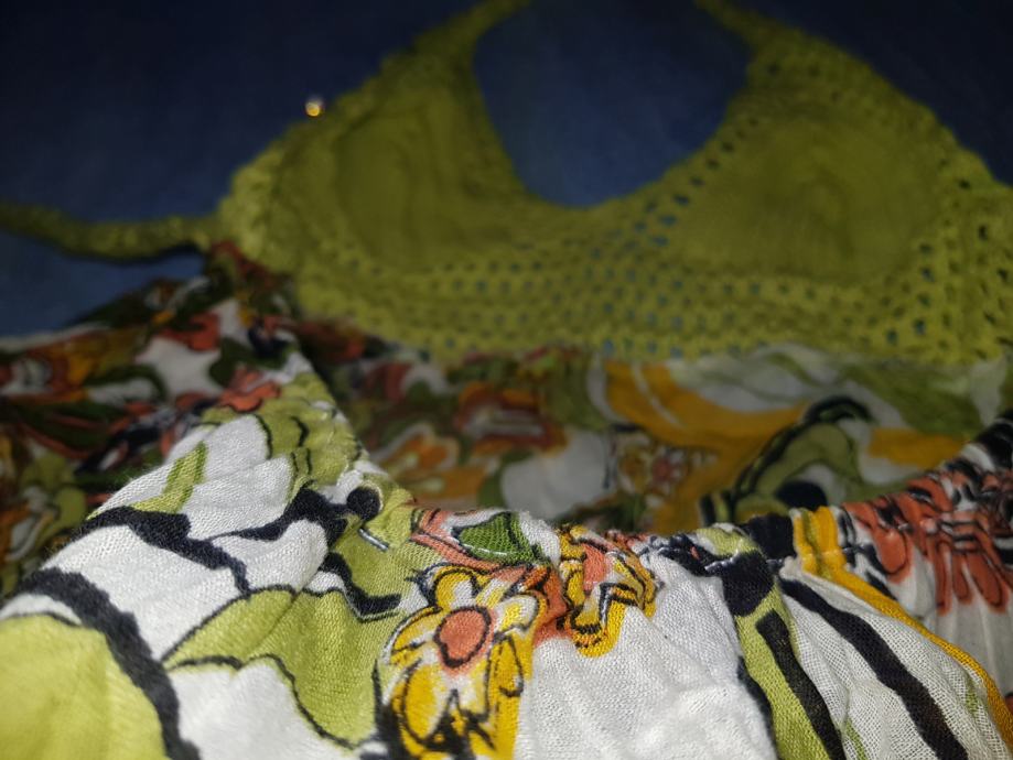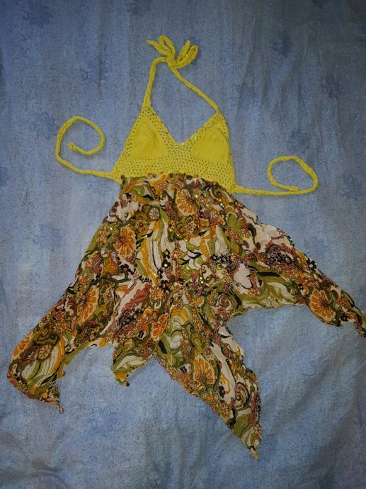 Prodam pisano tuniko za vroče dni. Zgornji del je pleten v obliki rumenega nedrčka, ki se zaveže okrog vratu, spodnji del je prosojen, seksi asimetričen z rožastim vzorcem, na hrbtnem delu ima elastiko. Všiti so bleščeči krogci. Priporočam za velikost S ali M.