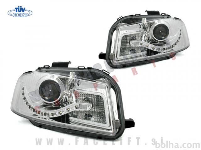 Halogenski žarometi z LED diodami za pozicijske luči in lečo za kratki snop. Žarometi so novi, z garancijo. V kompletu prejmete par, levi in desni žaromet.