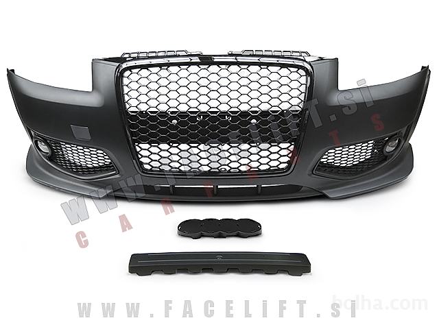 Sprednji odbijač. V kompletu prejmete odbijač, masko, mrežice meglenk, meglenke, nosilec emblema in nosilec registrske tablice. Možna montaža z ali brez Audi emblema.