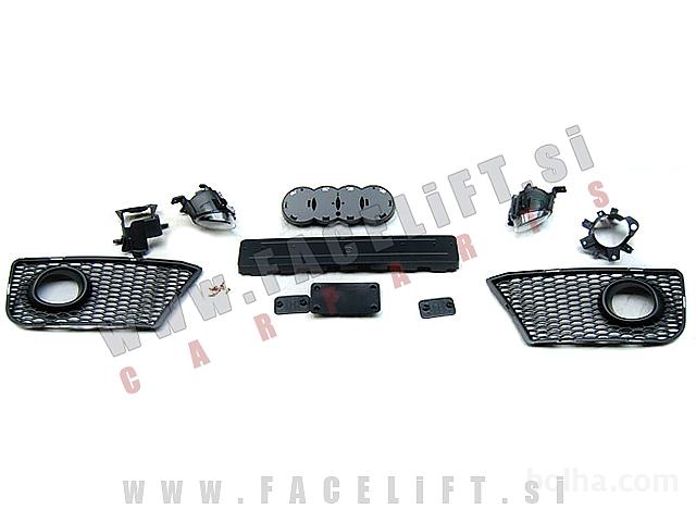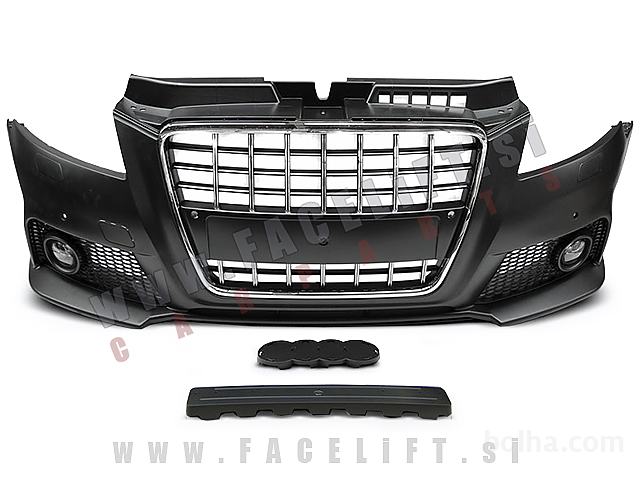 Sprednji odbijač. V kompletu prejmete odbijač, masko, mrežice meglenk, meglenke, nosilec emblema in nosilec registrske tablice. Možna montaža z ali brez Audi emblema.