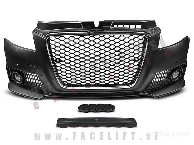 Sprednji odbijač. V kompletu prejmete odbijač, masko, mrežice meglenk, meglenke, nosilec emblema in nosilec registrske tablice. Možna montaža z ali brez Audi emblema.