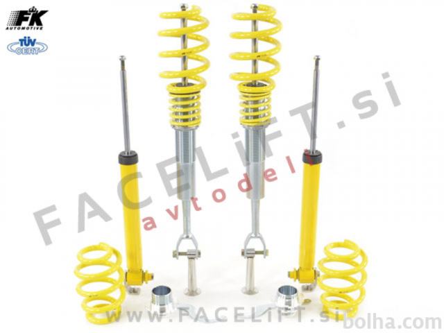 Nastavljivo vzmetenje (gewinde) FK. Vzmetenje je novo, z garancijo. Komplet vsebuje štiri amortizerje, štiri vzmeti in ključ za nastavitev višine.