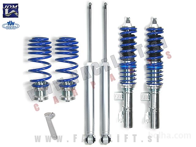 Nastavljivo vzmetenje (gewinde) JOM. Vzmetenje je novo, z garancijo. Komplet vsebuje štiri amortizerje, štiri vzmeti in ključ za nastavitev višine.