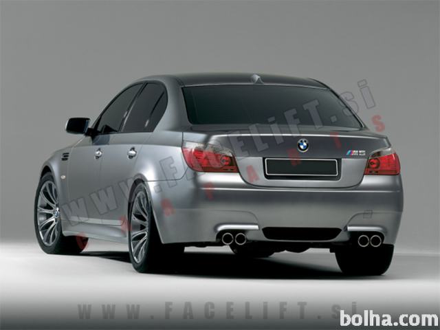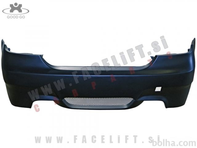 Zadnji odbijač M5 izgled. V kompletu prejmete zadnji odbijač z dvojnih izpuhom (Duplex), pokrov vlečne kljuke in srednjo mrežo. Odbijač je nov in pripravljen za barvanje (v primerju).