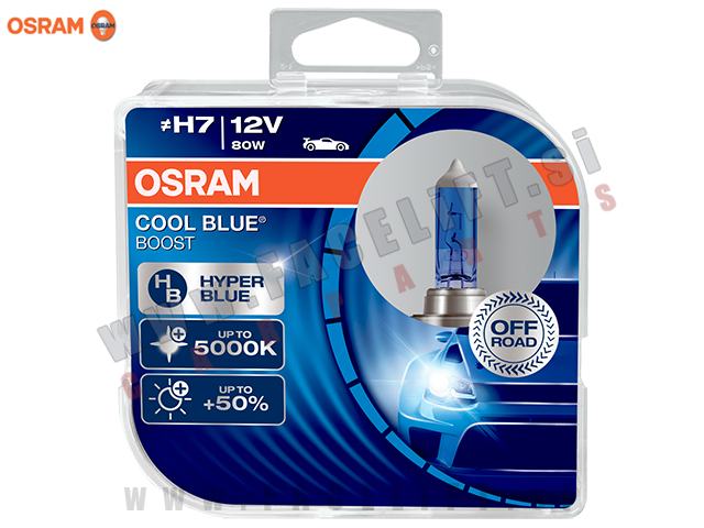 Set halogenskih žarnic Osram Cool Blue Boost 5000K +50% H7 80W 12V. Žarnica so nove. V kompletu prejmete par.