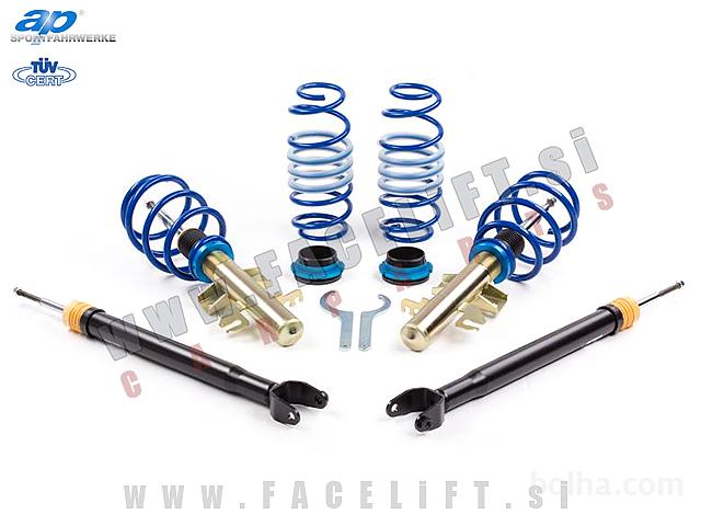 Nastavljivo vzmetenje (gewinde) AP. Vzmetenje je novo, z garancijo. Komplet vsebuje štiri amortizerje, štiri vzmeti in ključ za nastavitev višine.