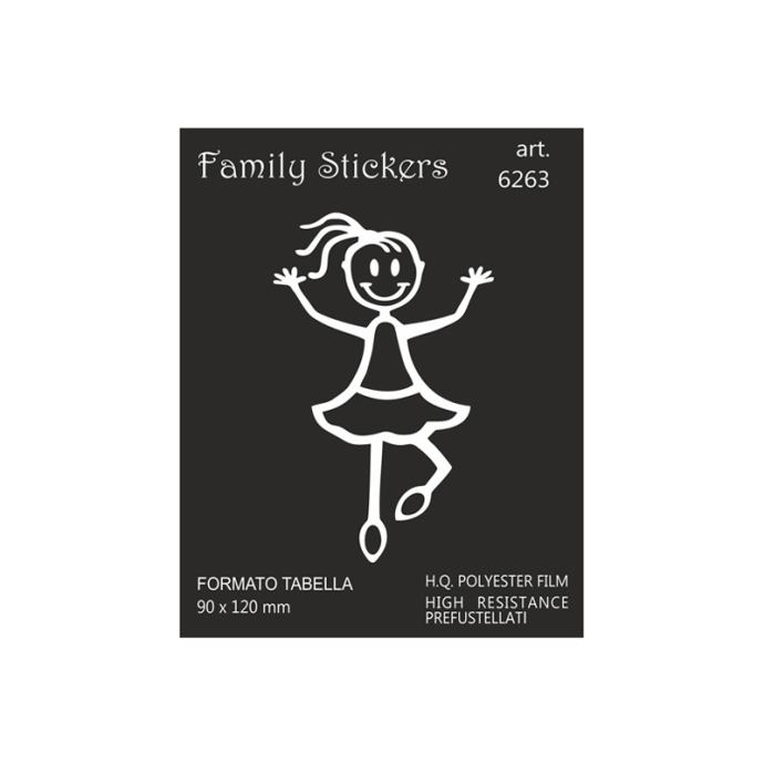 Nalepka Family Girl je nalepka s podobo punčke v krilu, stilizirano v beli barvi, na prozornem lepilnem papirju. Namenjena je okrasitvi zadnjega stekla na avtomobilu. Na voljo tudi podobe: mama, oče, punčka z balonom, dojenček, dojenčica, hišni ljubljenčki, fant s slušalkami, fant z rolko in fant z žogo. Enostavno izberete nalepke, ki predstavljajo člane vaše družine in okrasite svoj avtomobil.