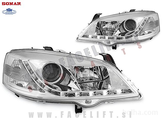 Žarometi z LED pozicijskimi lučmi in lečo. Žarometi so novi, z garancijo. V kompletu prejmete par, levi in desni žaromet.