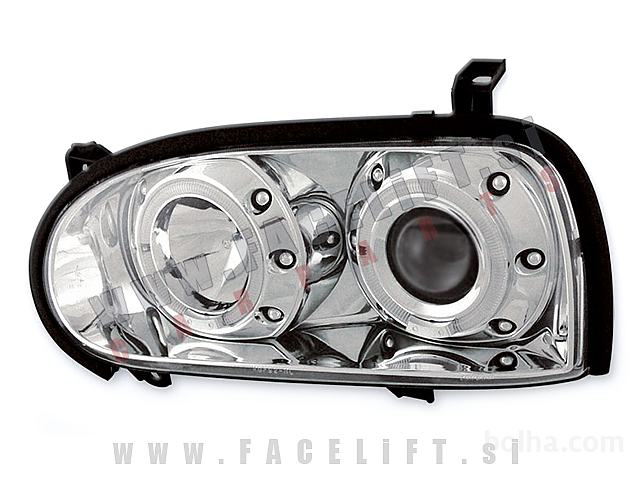 Žarometi z LED Angel Eyes za pozicijo in lečo. Žarometi so novi, z garancijo. V kompletu prejmete par, levi in desni žaromet.