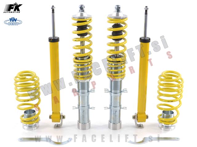 Po trdoti in višini nastavljivo vzmetenje (gewinde) FK. Vzmetenje je novo, z garancijo. Komplet vsebuje štiri amortizerje, štiri vzmeti in ključ za nastavitev višine.