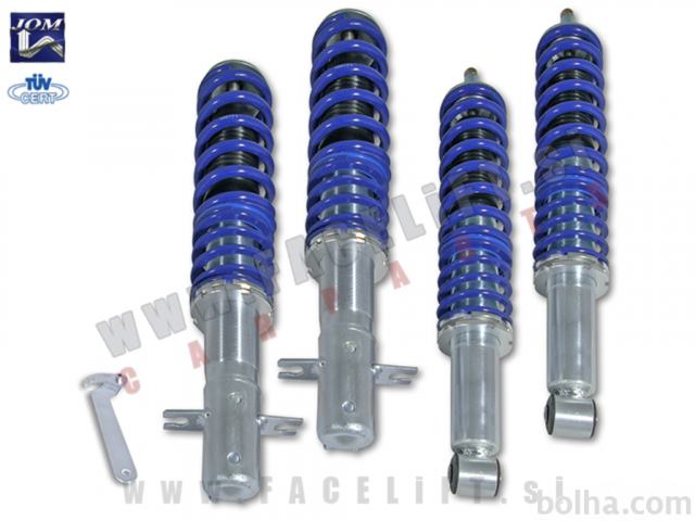 Nastavljivo vzmetenje (gewinde) JOM. Vzmetenje je novo, z garancijo. Komplet vsebuje štiri amortizerje, štiri vzmeti in ključ za nastavitev višine.
