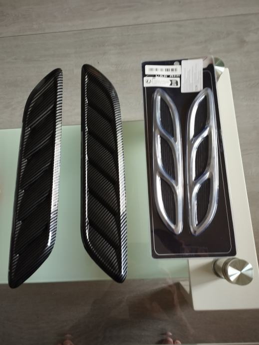 Prodam nove samolepilne reže za na pokrov motorja ali stranski blatnik. Krom-srebrna je dimenzij 27.5cm dolžina, ter 5cm širine. Karbonski dolžine 42cm,ter širine 8cm. Ugodno tudi nalepke za pnevmatike (good year). Vse kar je na slikah v kompletu cena 40evr.
