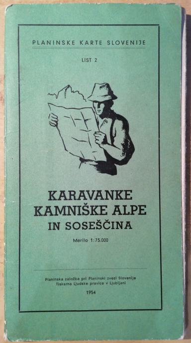 Karavanke, Kamniške Alpe in soseščina [Kartografsko gradivo] / priredili Valter Bohinec, France Planina in Vlasto Kopač ; narisal Vlasto Kopač, 1:75.000, [Ljubljana] : Planinska zveza Slovenije, 1954, 80 x 53 cm na listu 89 x 62 cm, zložen na 12 x 22 cm