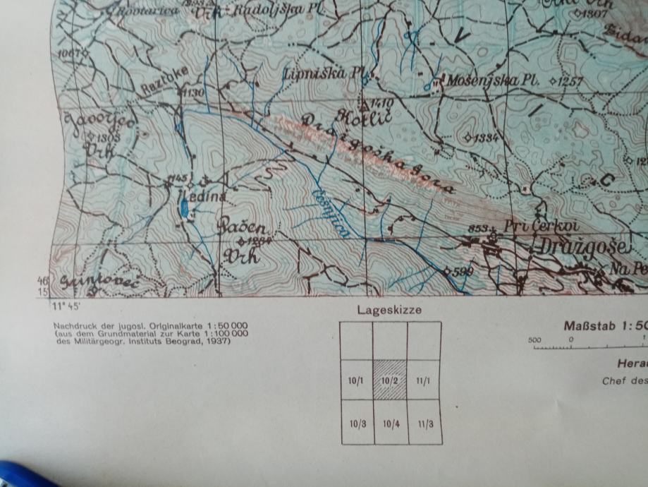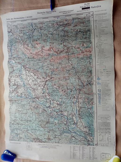 Vojaška topografska karta Deutsche Heereskarte, list Radovljica / Jesenice, merilo 1:50.000, izdana med 2. svetovno vojno (okoli 1943). Prikazuje območje Radovljice, Jesenic in Karavank. Karta je ponatis jugoslovanske predvojne karte in vsebuje vojaške legende, meje, vodotoke in višinske črte. Zanimiv zgodovinski kos iz časa okupacije.