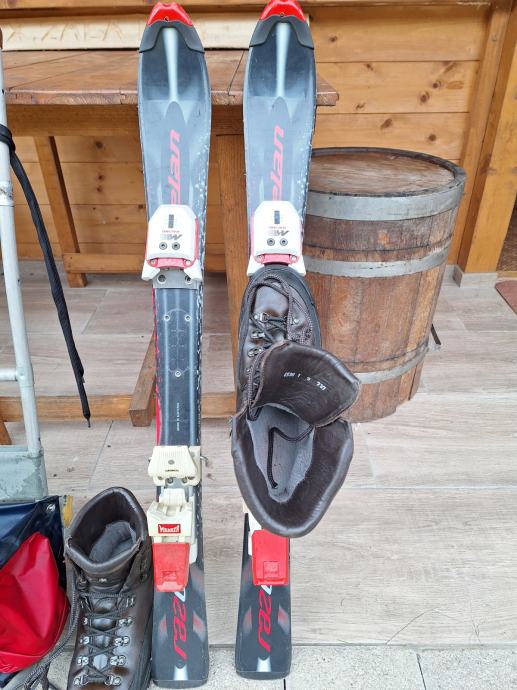 Smuči 90 cm za spuste, z vezmi, ki so primerne za pohodne čevlje in nosilni nahrbtnik za smuči.