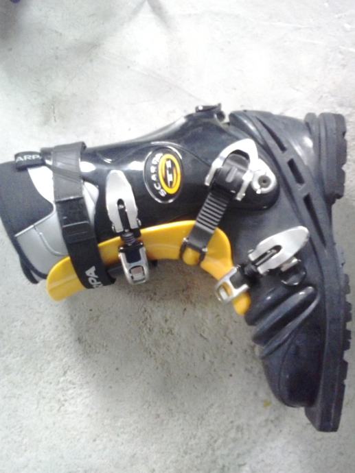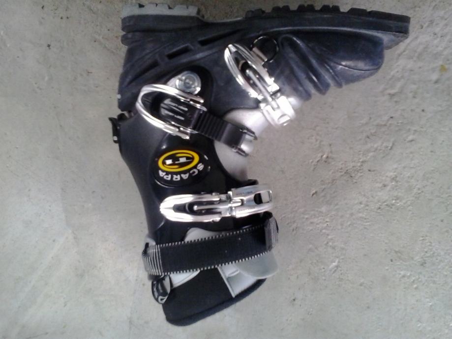Novi ,nerabljeni telemark turni čevlji italjanske znamke SCARPA. Model T1 je zelo lahek,zaradi spominske pene udoben,natančno nastavljiv zahvaljujoč alu mikro zaponkam in Velcro pasu,pri hoji po neravnem terenu pa protizdesno varen zaradi Vibram gumi podplata