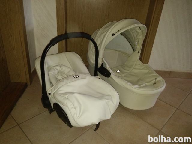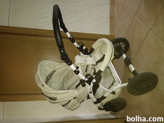 Dobro ohranjen otroški voziček. V kompletu je lupinica, košara in športni del. Vsak del ima poleg še zimsko pokrivalo, priloženo je pokrivalo za dež. Zraven spada še torba. Kolesa so napihljiva, sprednja kolesa se vrtijo za 360 stopinj.
