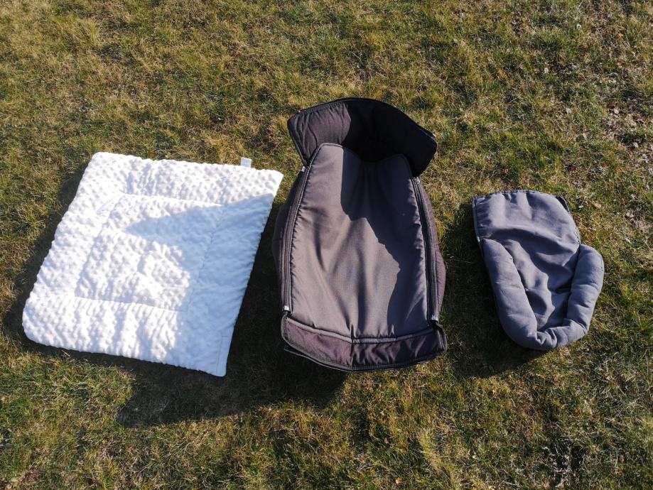 V kompletu sta dve košari in jajčka ter zimska vreča, pokrivalo za dež, torba, odejica...