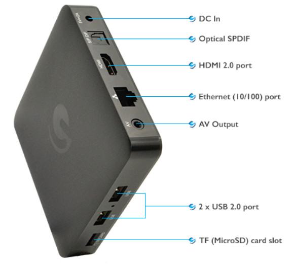 Podpira vmesnik: HDMI 2.0a x priključek (HDCP 2.2), USB; USB 2.0x2 priključek, LAN-RJ45 1x priključek.uSD; micro SDHC/XC x 1 reža, Napajanje; 1 priključek