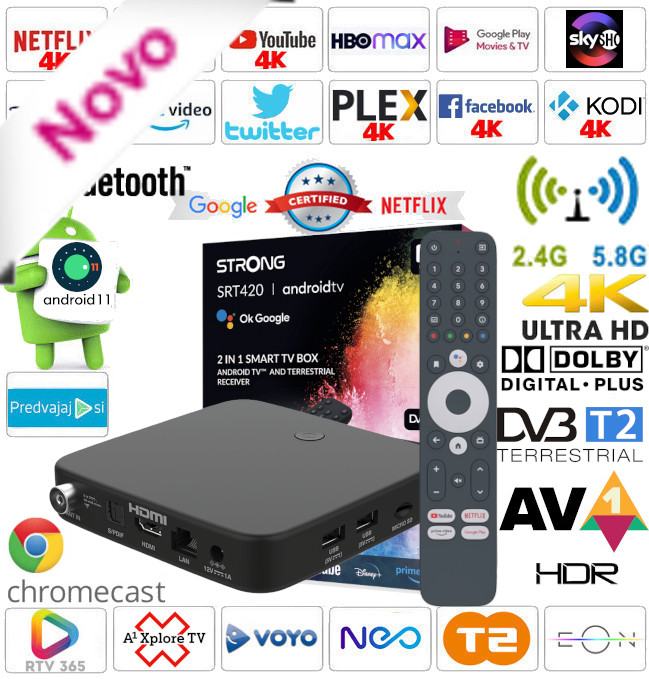 Strong SRT-420 je hibridni Android certifician Android 11 box, 4K UHD HDR, Dolby zvokom, AV1 slikovnim kodekom je Android mini računalnik, z štiri jedrnim procesorjem v 12nm tehnologiji podjetja Amlogic S905Y4 ARM CortexA35 2.0GHz je več kot le odličen multimedijski predvajalnik za reprodukcijo multimedijskih datotek, vključno z MKV, AVI, MOV in sprejemnik prizemeljskega DVB-T2 signala.