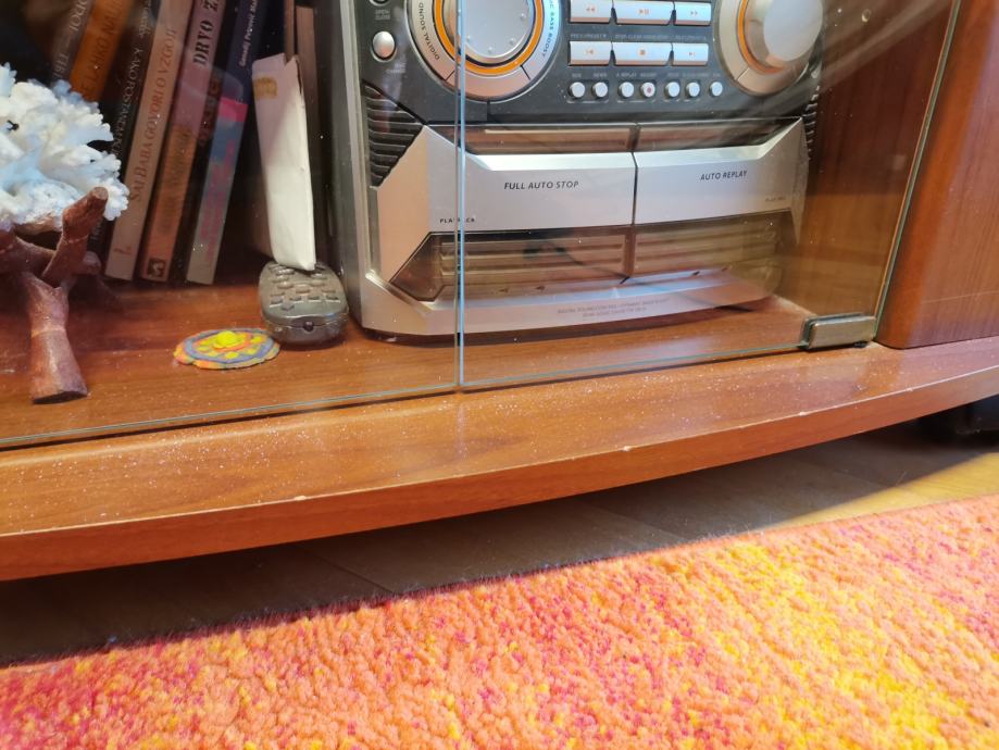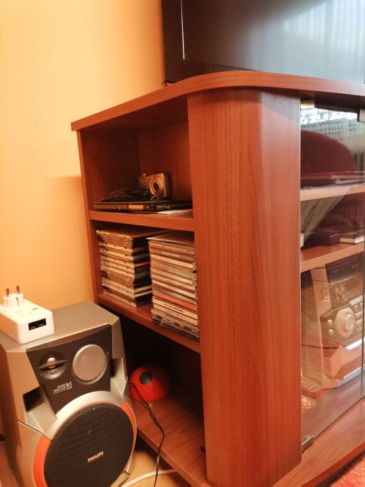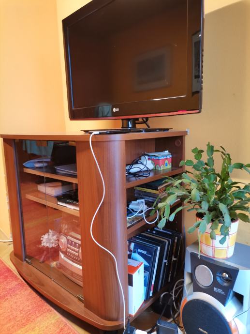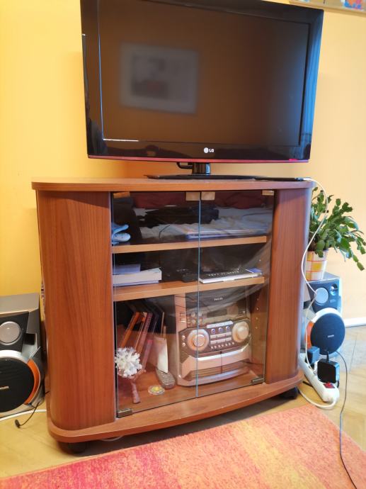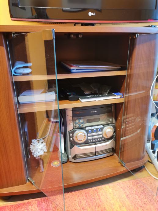 Ima steklena vrata, odprtino zadaj, da kabli ostanejo elegantno skriti.