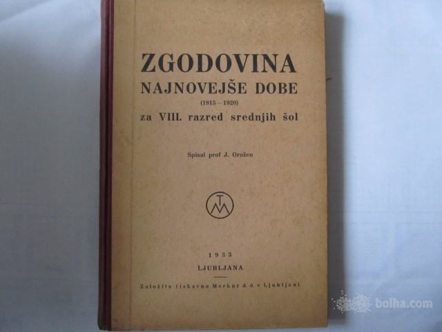 Knjiga Zgodovina najnovejše dobe (1815-1920), J. Orožen. Za VIII. Razdred srednjih šol. Založila tiskarna Merkur d.d. V Ljubljani, 1933, Ljubljana. Str. 198. Trde platnice, izredno ohranjena.