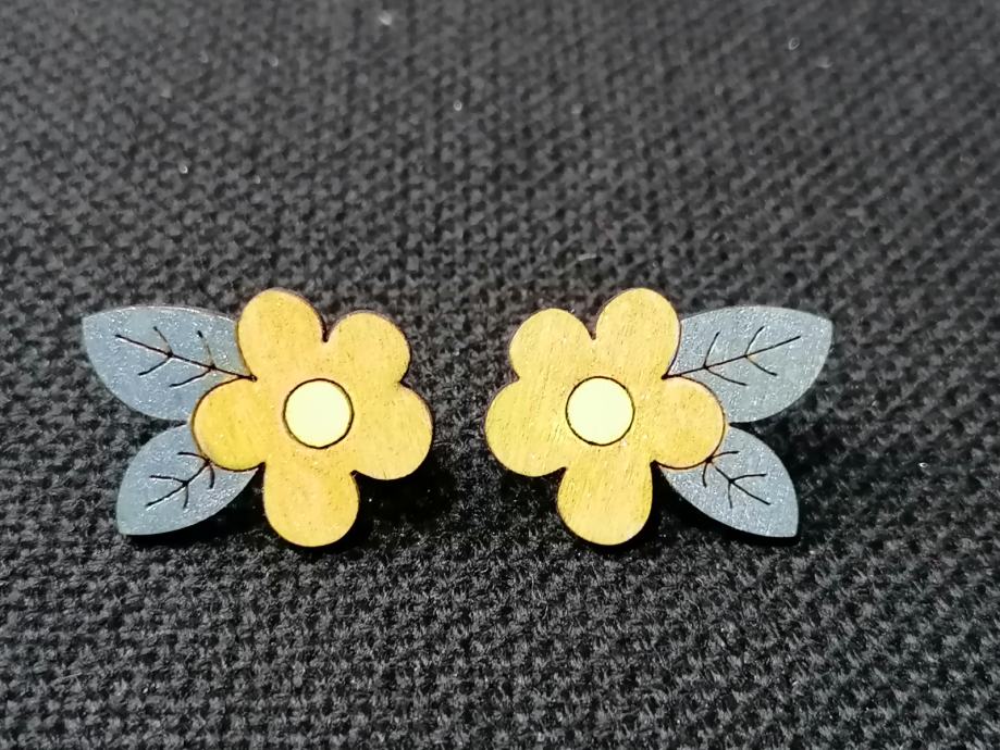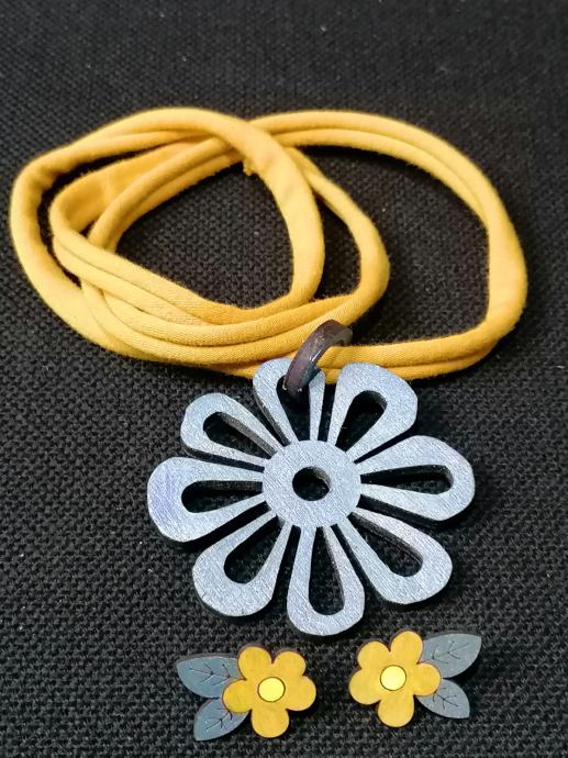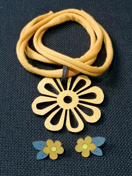 Novi uhani širine 2cm so izdelani iz tankega lesa in so zelo lahki, ogrlica je premera 6cm in je na eni strani modra, na drugi pa rumena. Cena za komplet je 10€.