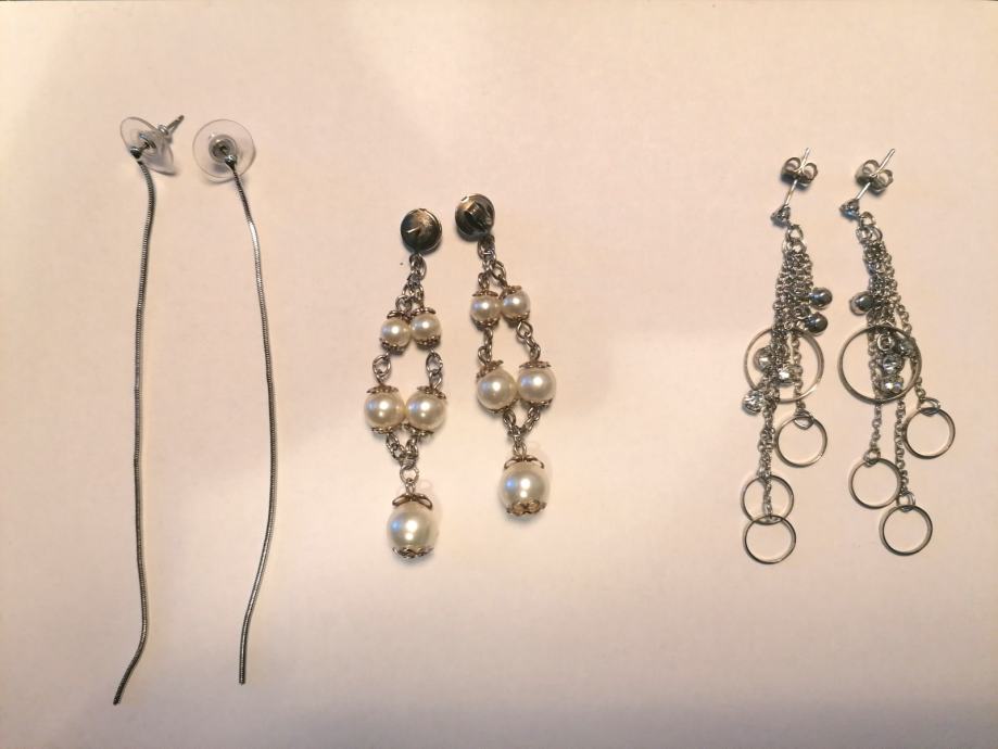 Podarim tri pare visečih uhanov. Na enem uhanu manjka metuljček zadaj (glej fotografijo).
