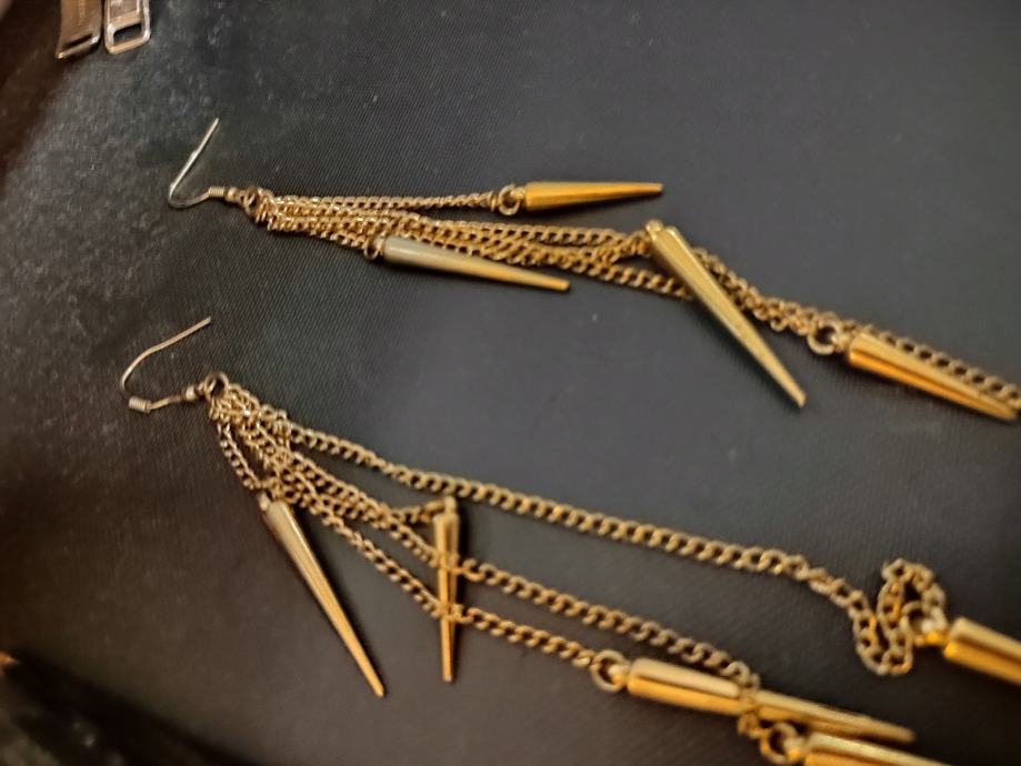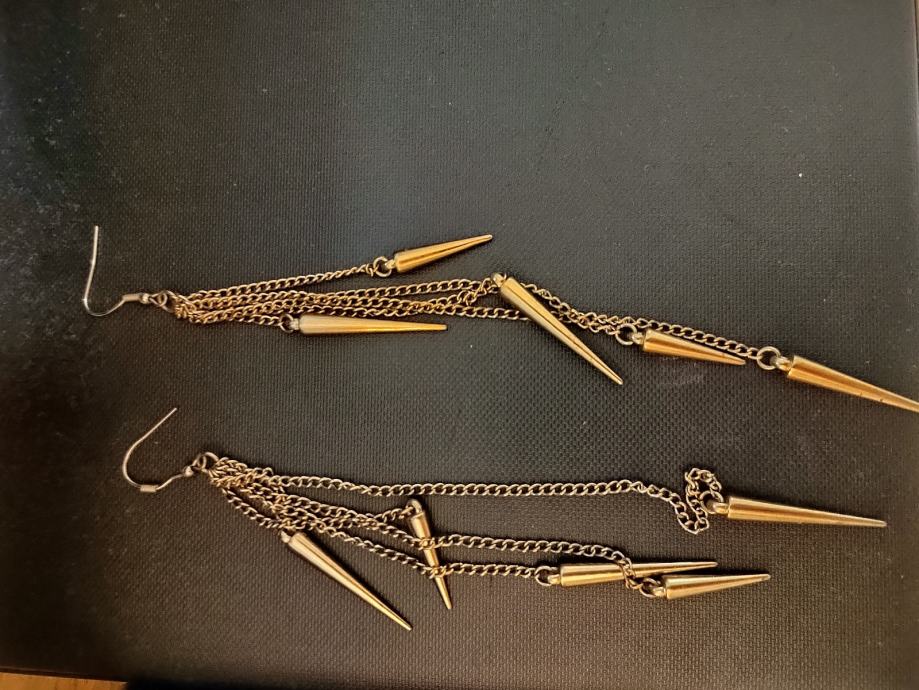 Prodajam rabljene viseče uhane v zlati barvi z okrasnimi kovinskimi verižicami in koničastimi detajli. Uhani so izjemno elegantni in dolgi, primerni za večerne priložnosti. Kljub rabljeni oznaki so v dobrem stanju in bodo popestrili vsak modni dodatek.