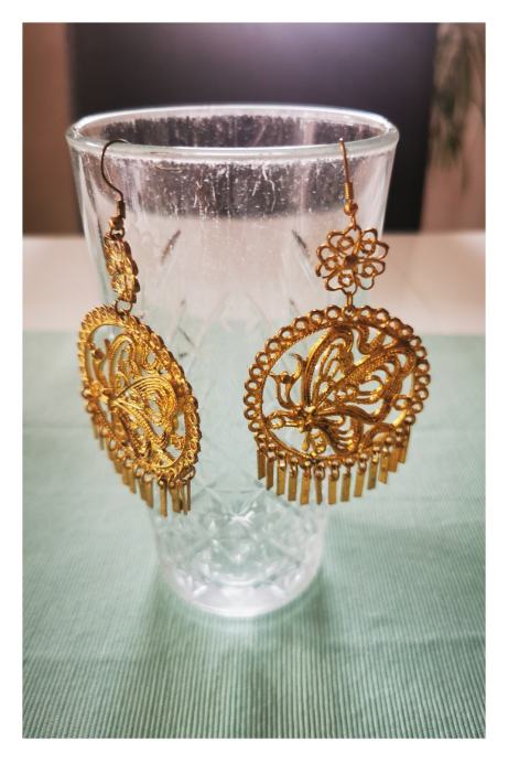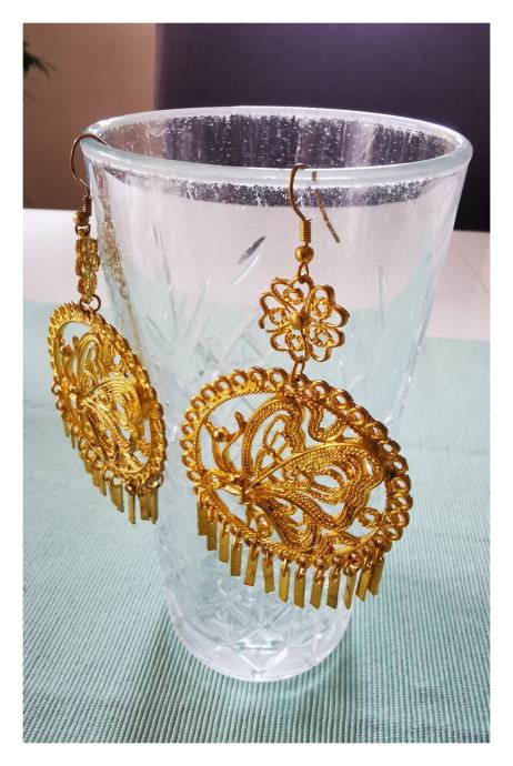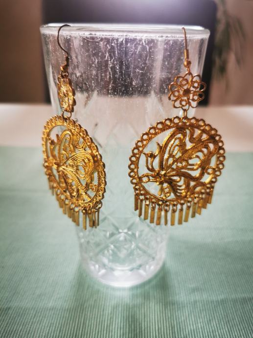 Veliki okrogli uhani v zlati barvi z izjemnim dekorativnim vzorcem in resicami. Dolžina ca 10 cm, premer kroga ca 5 cm.