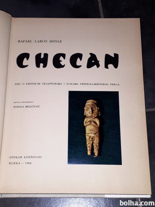 Prodam lepo ohranjeno knjigo CHECAN, Rafael Larco Hoyle, 1968; to je esej o erotčnih skulpturah in slikah v predkolumbovskem Peruju.