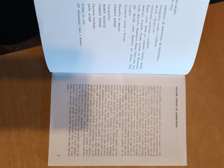 Naslov Votivne podobe na Gorenjskem : [razstava], Gorenjski muzej v Kranju 1964 / [besedilo in seznam France Zupan ; fotografije Boris Sajovic, France Zupan ; prevode v angleški, francoski in nemški jezik so oskrbeli Fanny S. Copeland, Sidonija Jeras, Janko Golias]